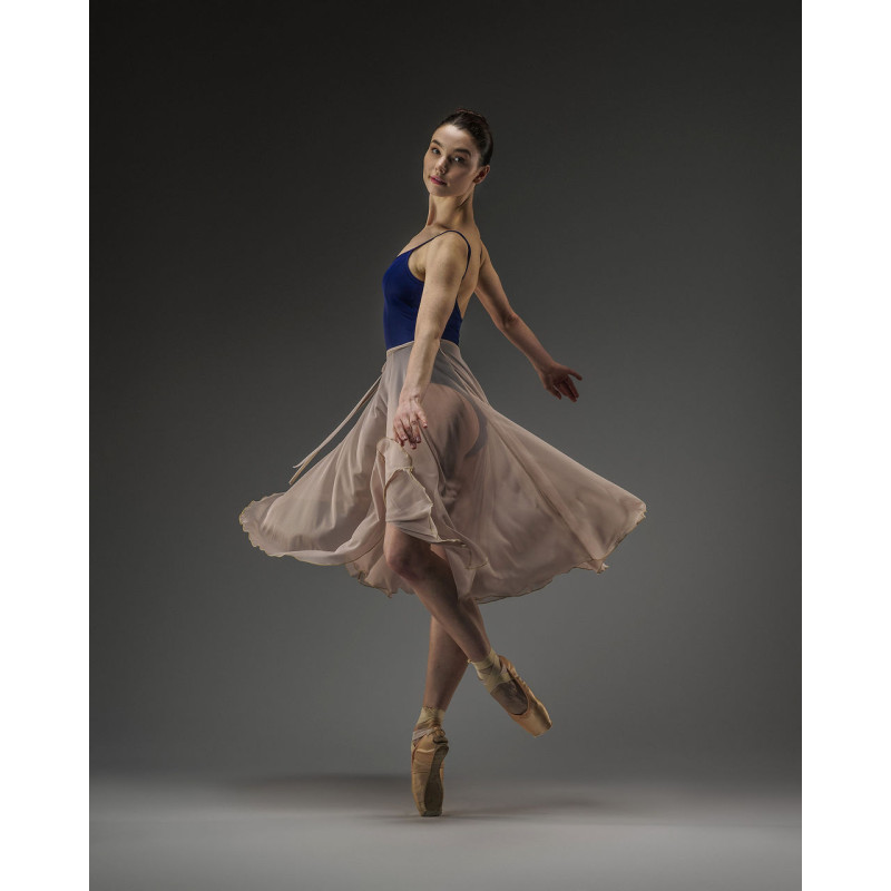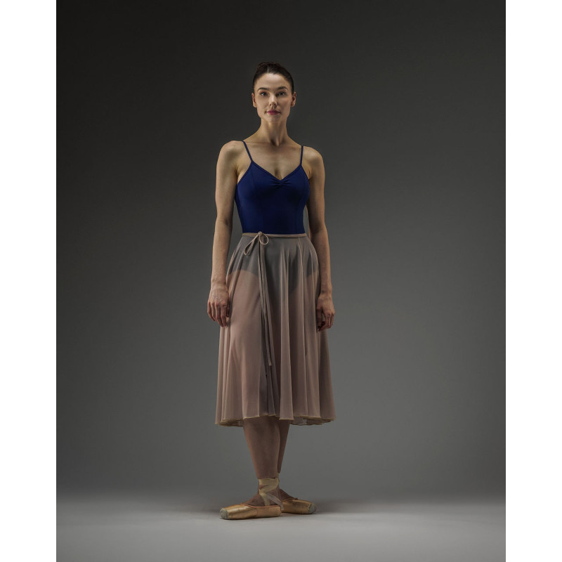 Featuring 1/2" chiffon wrap ties cut to a generous 44" length, this skirt offers versatility in styling while ensuring a secure fit. To add a touch of elegance, it is finished with a 1/16" pearl hem.